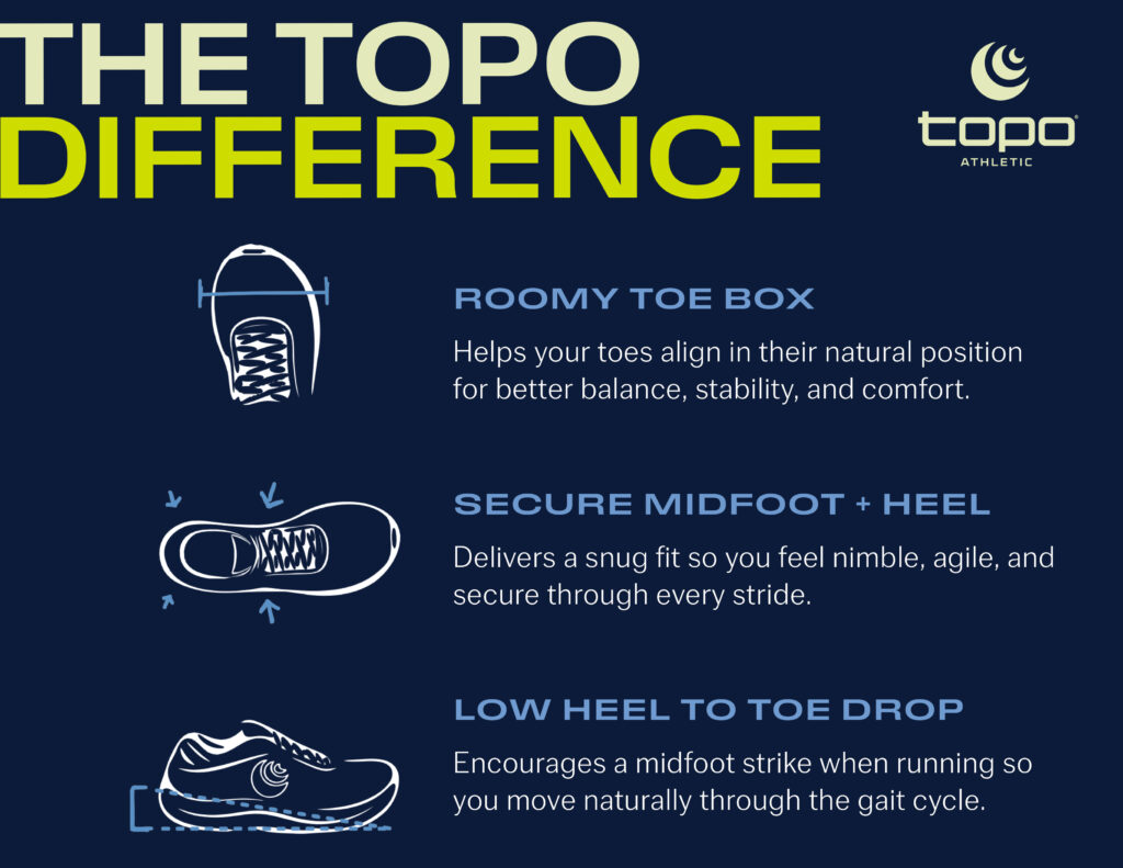 Topo Athletic offers a unique fit and feel that encourages instinctive and natural movement that works seamlessly with the biomechanics of the foot.